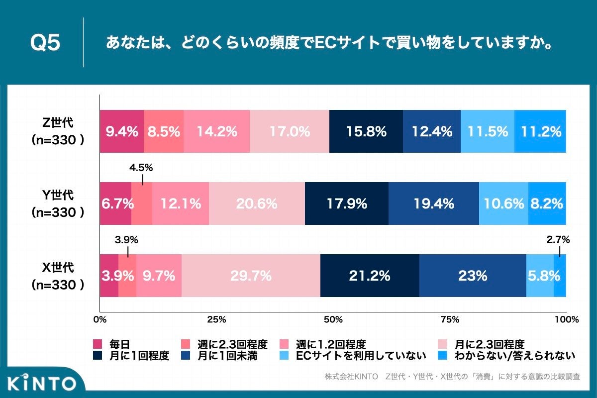 Q5. ECサイトでの買い物頻度、全ての世代で「月に2.3回程度」が最多