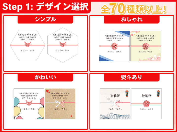 まずはスマートフォン上で、自分の好みに合わせた水引シールのデザインを選択します。シンプル、おしゃれ、かわいい、熨斗ありなど、豊富なデザインカテゴリからお気に入りを見つけてください。