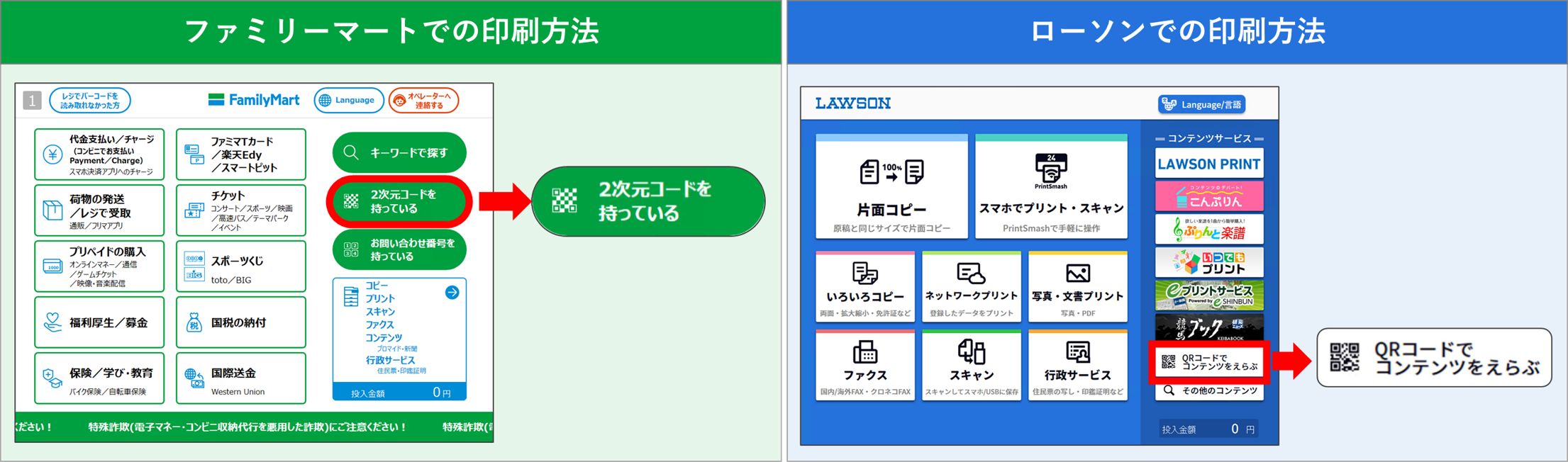 ファミリーマートでは「2次元コードを持っている」から、ローソンでは「QRコードでコンテンツをえらぶ」から、それぞれ購入することができます。