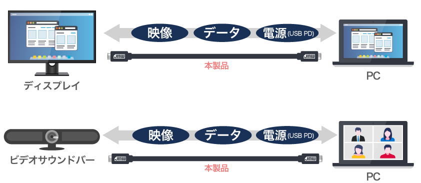USB Power Delivery対応により、2mのJM-U3CC02/100Wは最大100W(20V/5A)、3mのJM-U3CC03/60Wは最大60W(20V/3A)の大きな電力の供給を行うことができます。PCなどのソース機器とディスプレイを本ケーブルで接続すれば、ディスプレイからソース機器へ、またはソース機器からディスプレイへ電源を供給できるため、配線をすっきりとまとめることができます。