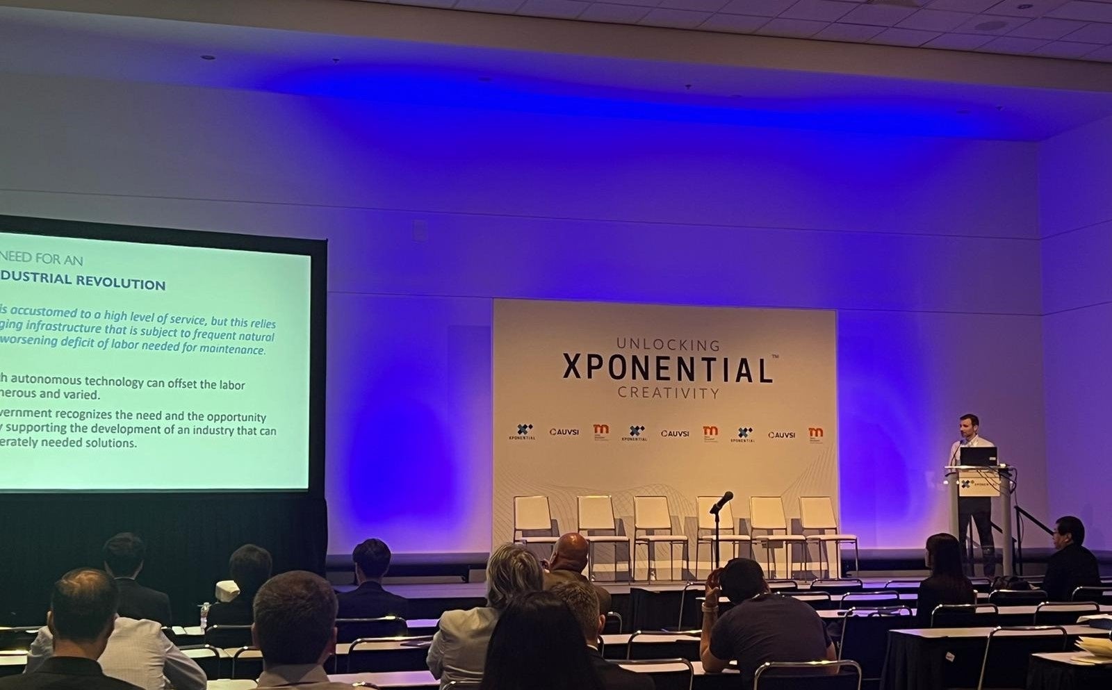 「JAPAN’S URGENT NEED FOR AN UNMANNED INDUSTRIAL REVOLUTION」と題したChrisのプレゼンテーションでは、日本におけるドローンを含めた無人システムの普及は、自然災害、インフラの老朽化、出生率の減少、都市部への人口集中、生活の高水準化の5つの要因によってけん引されていること、インフラ点検、災害対応、物流、農業などさまざまな用途でドローンを導入することが、日本の社会課題や地理的条件などの特有の条件下でいかに有利であること、そして、これらの用途を支える産業の発展を加速するために日本政府が行っていることを説明しました。