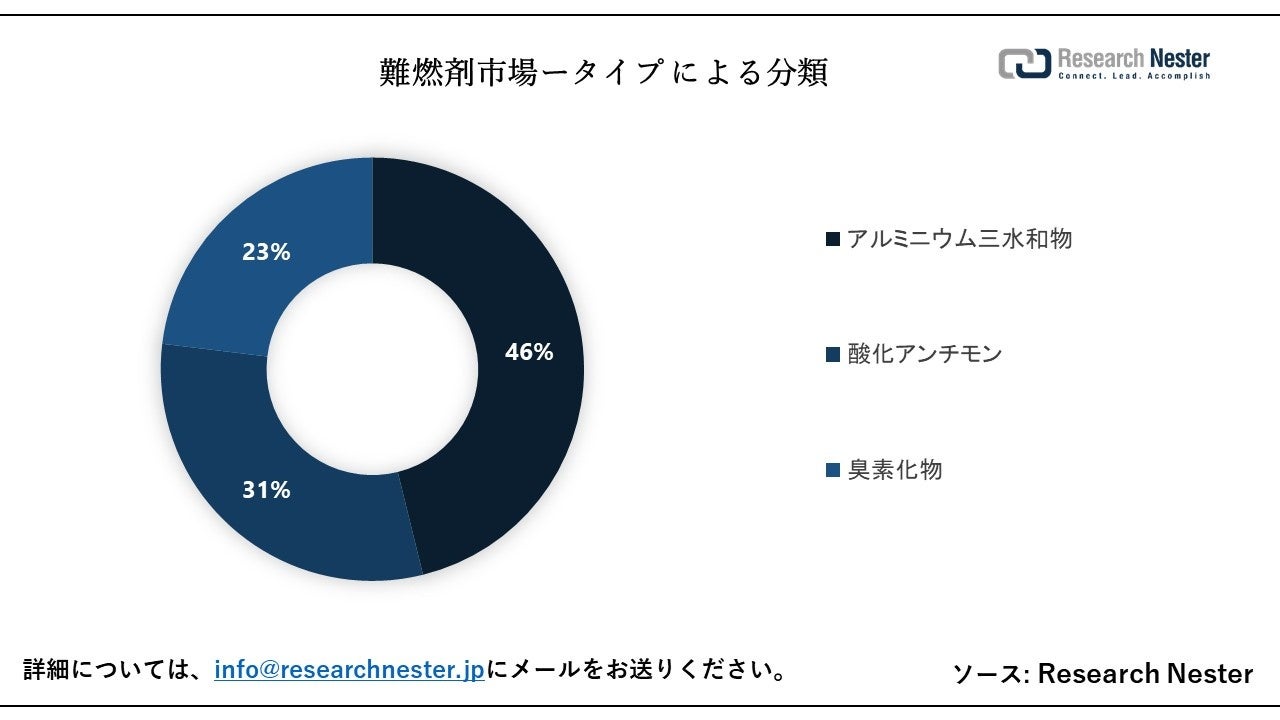 また、市場は、アルミニウム三水和物、酸化アンチモン、臭素化物にタイプ別に分割され、需要と供給が分析されています。これら 3 つのセグメントの中で、アルミニウム三水和物セグメントは 2035 年に大きなシェアを獲得すると予想されます。当社の難燃剤市場調査によると、ATH 化合物の需要は、環境への影響の減少とハロゲンの使用を管理する厳格な法律の結果として増加し、この部分が予測期間の主要セグメントの 1 つとなるです。市場は、アジア太平洋地域における臭素化化合物の需要の増加によって牽引されると予想されます。その結果、今後数年間でこの分野の成長に向けた多くの機会が生まれることが予想されます。