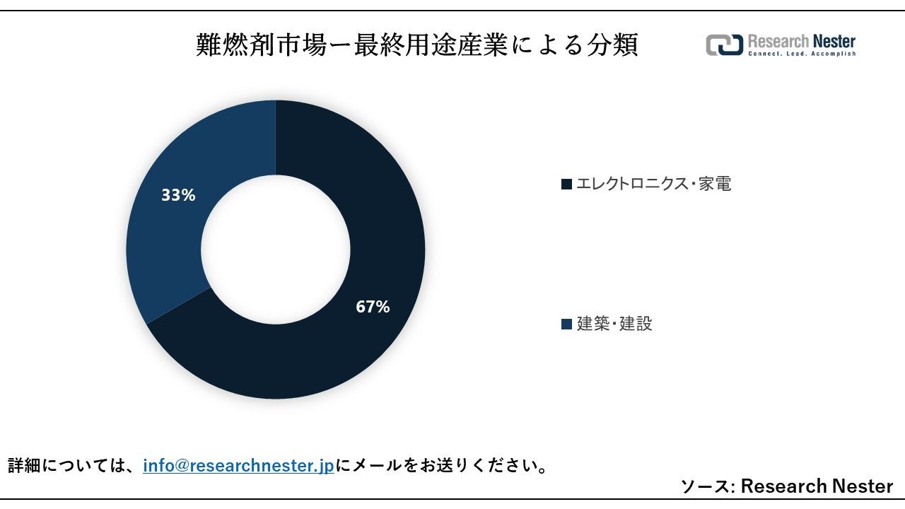 当社の難燃剤市場調査によると、最終用途産業別に需要と供給を建築・建設とエレクトロニクス・家電に分割して分析されています。2 種類の難燃剤のうち、エレクトロニクスおよび家電分野は、2035 年には最大約 34% の最大の市場シェアを獲得すると推定されています。この部門の成長は、製造中に難燃剤の使用によって化学物質が環境に到達したり、消費者の健康に影響を与えたりするのを防ぐための、コンピューター、タブレット、スマートフォン、その他の新しい電子機器に対する需要の高まりによるものと考えられます。インドの国内エレクトロニクス生産は 290 億米ドルから 815 億米ドルまで 23% 以上増加し、年平均成長率は 23% でした。