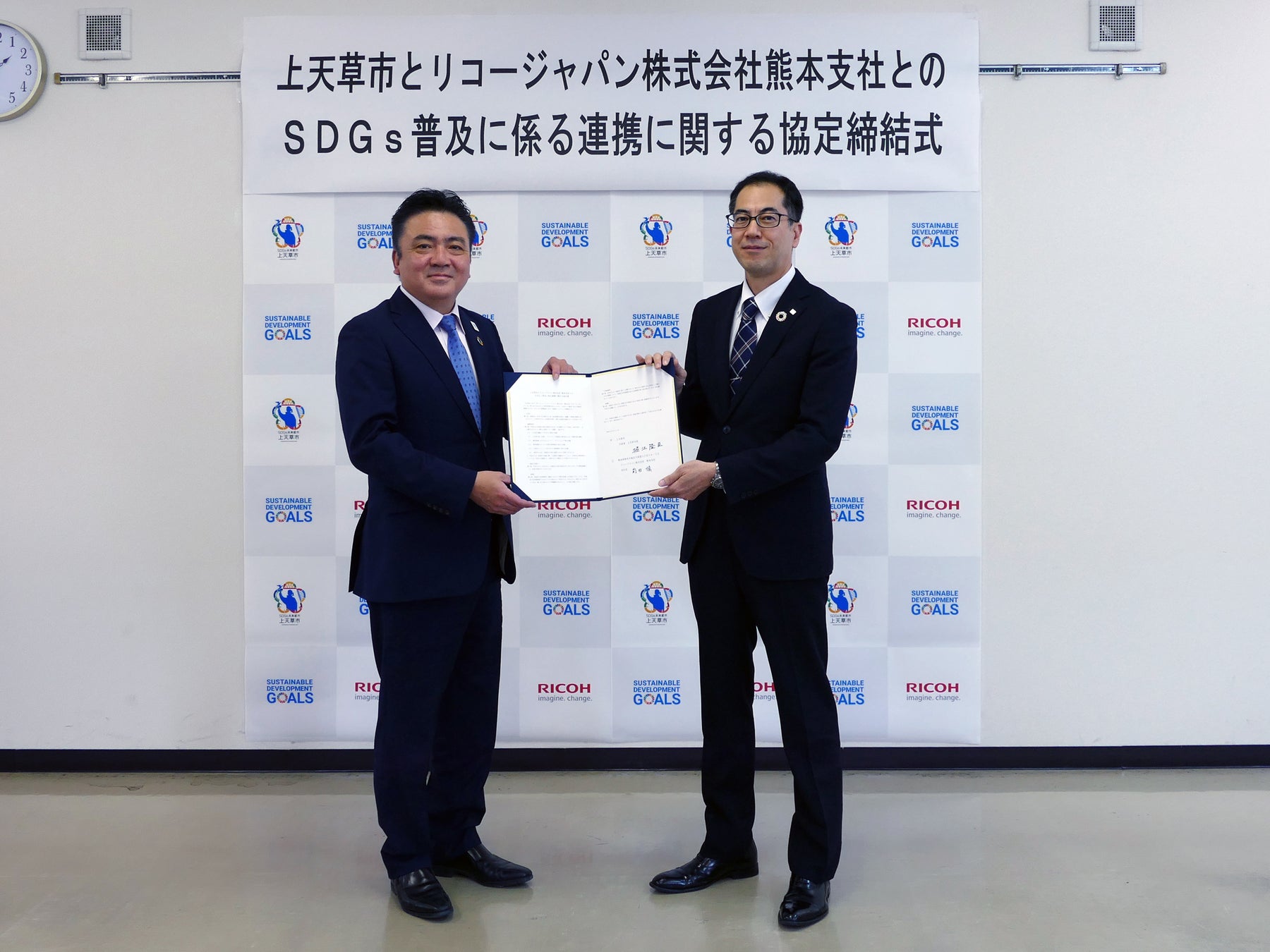 左から、上天草市 堀江 隆臣 市長、リコージャパン 熊本支社長 前田 慎
