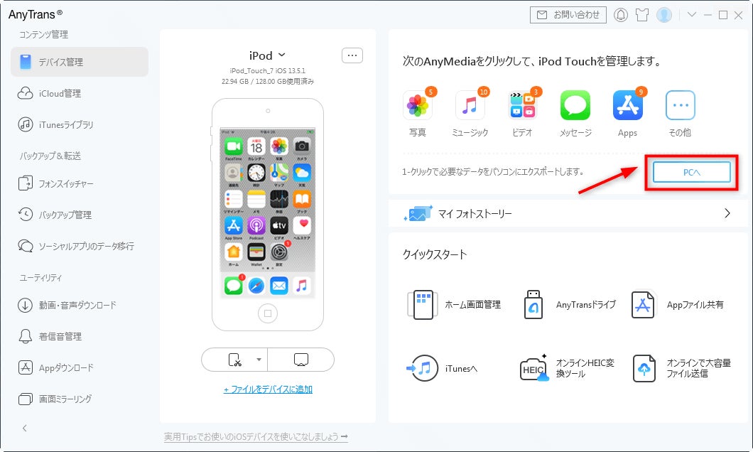 Step 1. USBケーブルでiPodをPCに接続し、AnyTransを起動します。iPodが認証されたら、 右の「PCへ」/「Macへ」ボタンをクリックします。