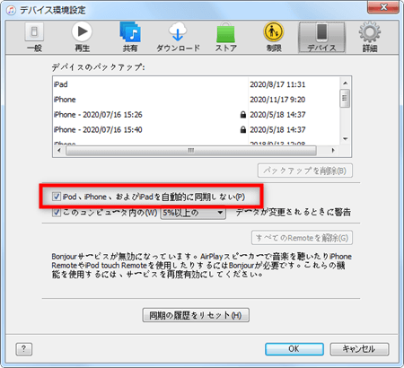 iTunesを起動し、「編集」>「環境設定」の順でクリックして、「デバイス」項目から「iPod、iPhone、および iPad を自動的に同期しない」にチェックを入れます。こうすると、iPodのデータがiTunesのデータに上書きされません。