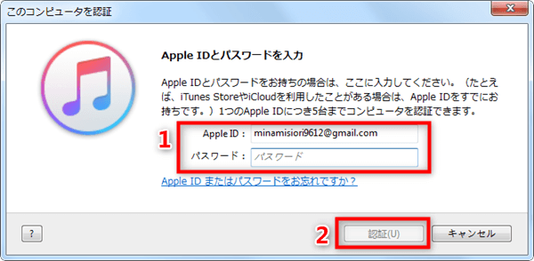 2.音楽を購入した時に使われているApple IDとパスワードを入力し、「認証」をクリックします。