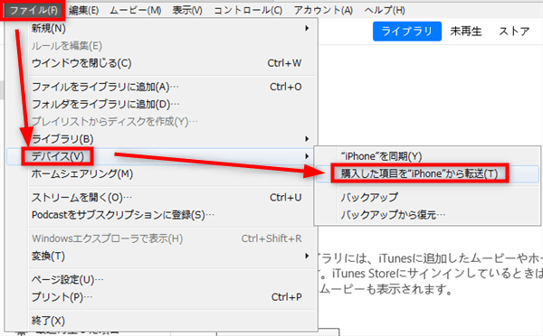 3.iPodやiPhoneをパソコンに接続して、接続アクセスを許可してから、「ファイル」>「デバイス」>「購入した項目転送」の順でクリックします。