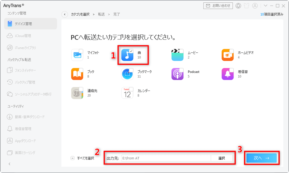 Step 2. 「曲」にチェックを入れ、出力先を設定してから、「次へ」ボタンをクリックします。