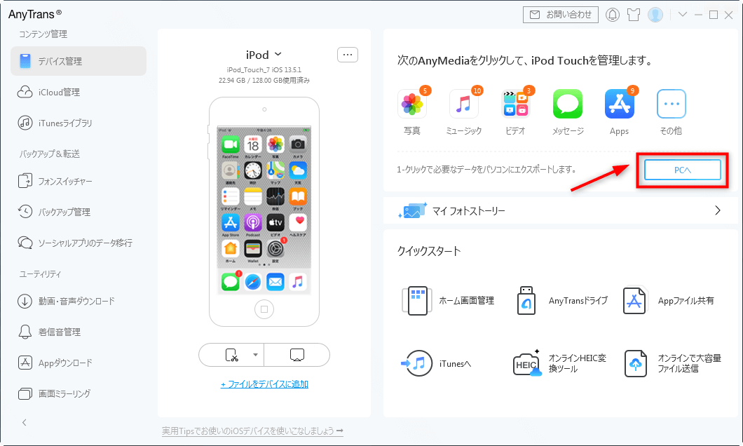 Step 1. USBケーブルでiPodをPCに接続し、AnyTransを起動します。iPodが認証されたら、 右の「PCへ」/「Macへ」ボタンをクリックします。