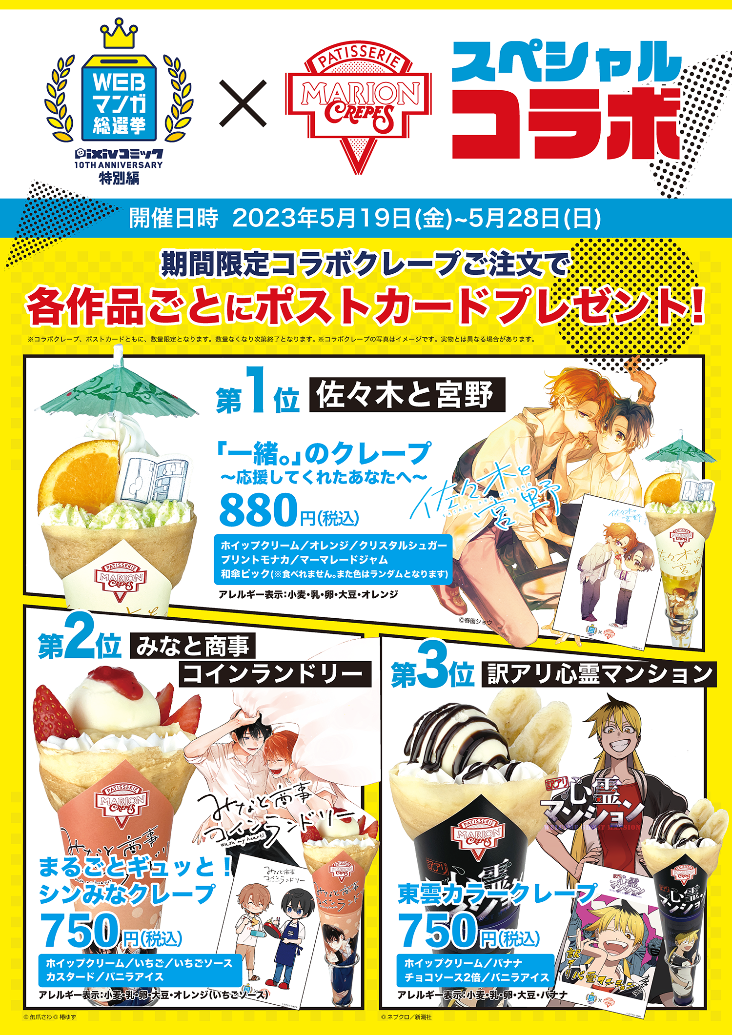 マリオンクレープの一部店舗にて、「WEBマンガ総選挙 pixivコミック10周年 特別編」1〜3位受賞作品をイメージした特別メニューを販売いたします。コラボクレープをご注文いただいた方に、各作品ごとのオリジナルポストカードをプレゼントいたします。
