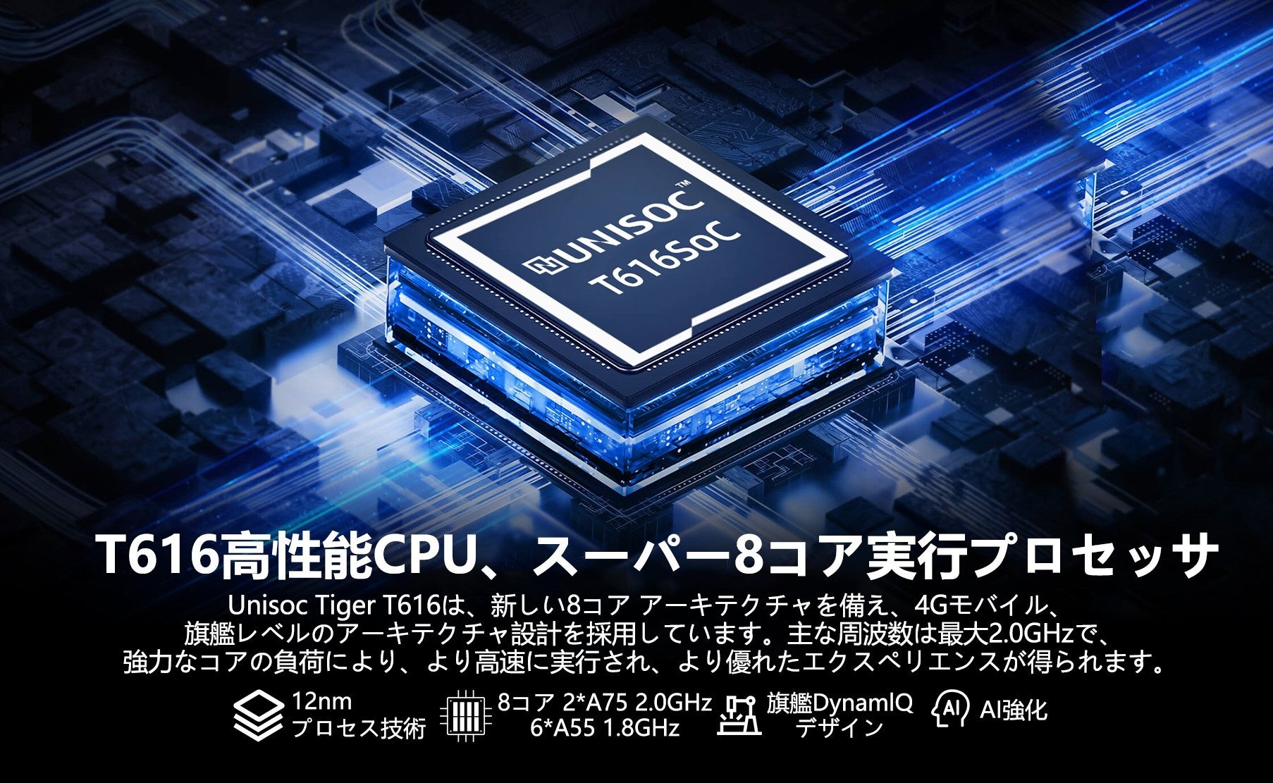 MaxPad I11PlusタブレットはUNISOC T616の強力な8コア高速処理チップを搭載し、A75アーキテクチャコアを使用、最大周波数は2.0 Ghz対応、AnTuTu実行ポイントは255,000を超えます。