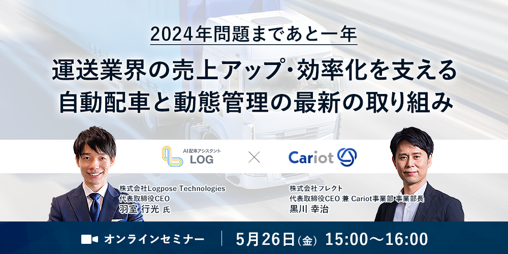 株式会社フレクト(本社:東京都港区、代表取締役CEO:黒川 幸治、以下フレクト)は、株式会社Logpose Technologies(本社:東京都渋谷区、代表取締役社長:羽室 行光、以下「Logpose」)との合同で、オンラインセミナー「2024年問題まであと一年。運送業界の売上アップ・効率化を支える自動配車と動態管理の最新の取り組み」を2023年5月26日(金)に開催します。