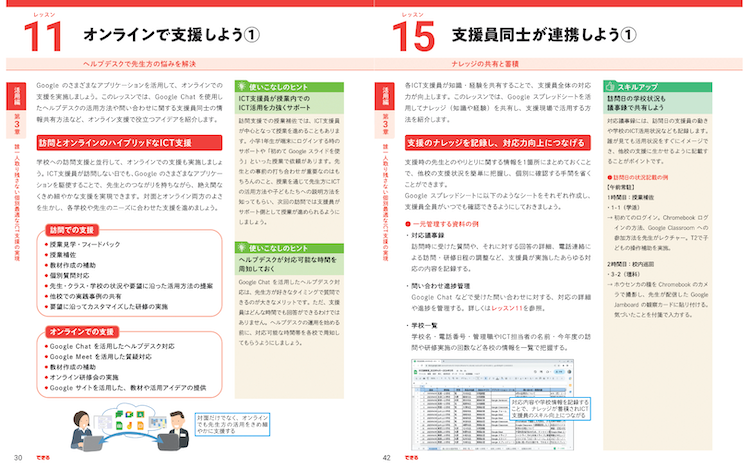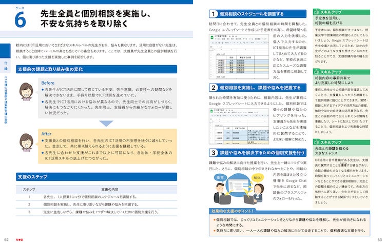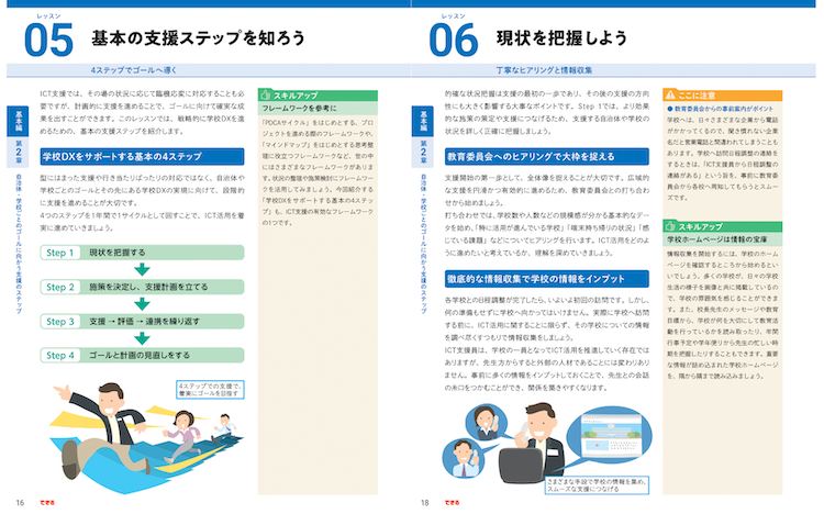 本書では、支援前の状況把握から支援施策の決定、計画の見直しまで、戦略的にICT支援を進めるための手法を4ステップで紹介しています。さらに、ICT支援員から教育委員会への進捗報告資料の例なども画像付きで具体的に掲載。教育委員会・学校・GIGAスクール運営支援センターが一丸となってGIGAスクール構想や学校DXの実現を目指すためのメソッドをご理解いただけます。