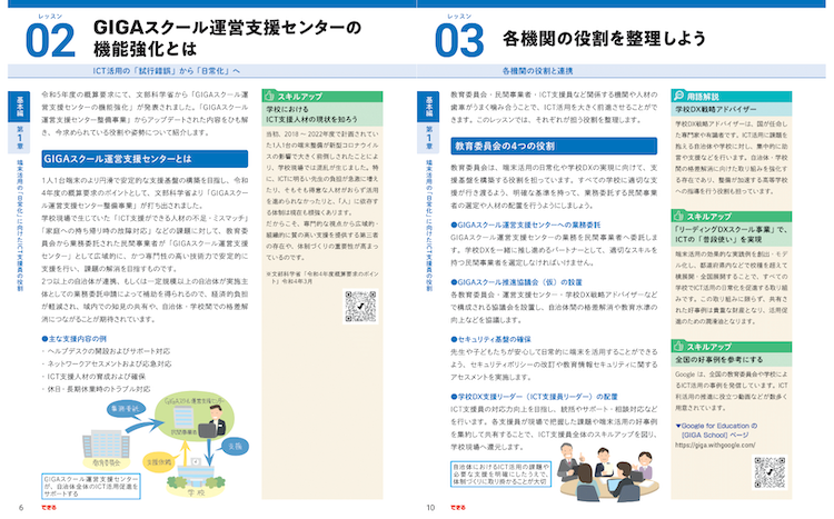 学校関係者の方々には「最適なパートナーとなるGIGAスクール運営支援センターを選定する際の1つの基準」として、また、GIGAスクール運営支援センターを運営する民間企業の方々には「ICT支援員のスキルアップのための参考書」として、大変充実した内容となっています!