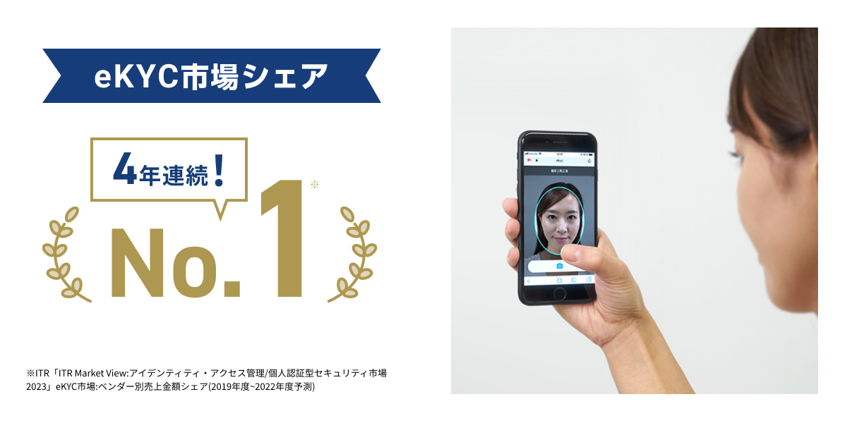 ネット上での契約やアカウント登録、口座開設時などに必要な身元確認をオンライン完結で行うサービスです。運転免許証やマイナンバーカードなどの本人確認書類の撮影、もしくはICチップの読み取りを行い、自撮りの顔写真との照合を行う方式や、公的個人認証を活用した方式を提供しています。学割などの年齢確認にも対応可能です。独自のAI技術、生体認証技術、OCR技術などにより、撮影開始から完了までの離脱率の低さを実現し、累計本人確認件数は2,000万件を突破しています。
