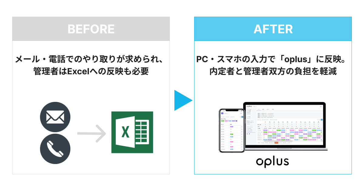 当社では内定者インターンを実施しており、毎年12月頃から内定者と連絡を取り、翌年4月までのインターンとしての稼働スケジュールを確認しています。Excel管理のもと、スケジュール変更がある場合には内定者から随時メールや電話にて対応をしていましたが、共有漏れなどもあり、管理に工数がかかっていました。