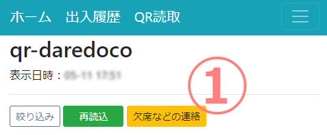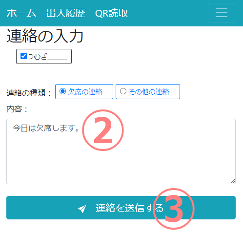 ①「欠席などの連絡」ボタンをタップします。