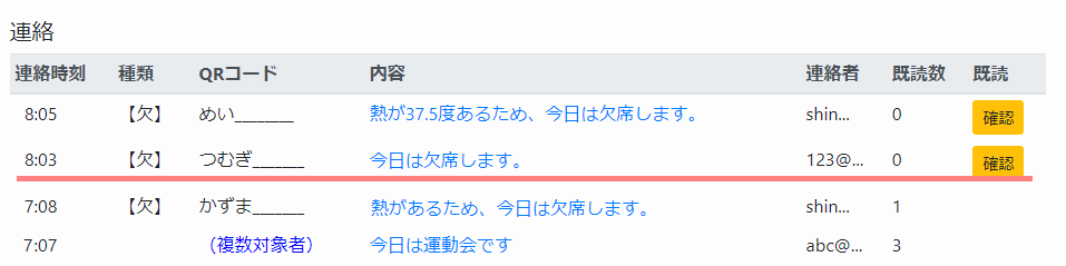 施設側では連絡がリスト表示されます。既読の「確認」ボタンを押すことにより既読数がカウントアップされ、既読を確認することができます。