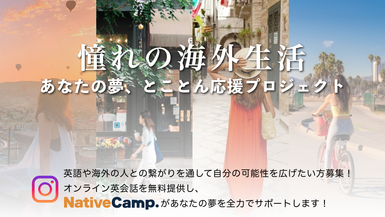 英語学習は言語習得ではなく、学ぶ過程の中で世界に対しての視野が広がり、自身の可能性を広げることができます。ネイティブキャンプは英語を身につけて海外に挑戦する方をサポートするため「あなたの夢、とことん応援プロジェクト」を開催いたします。