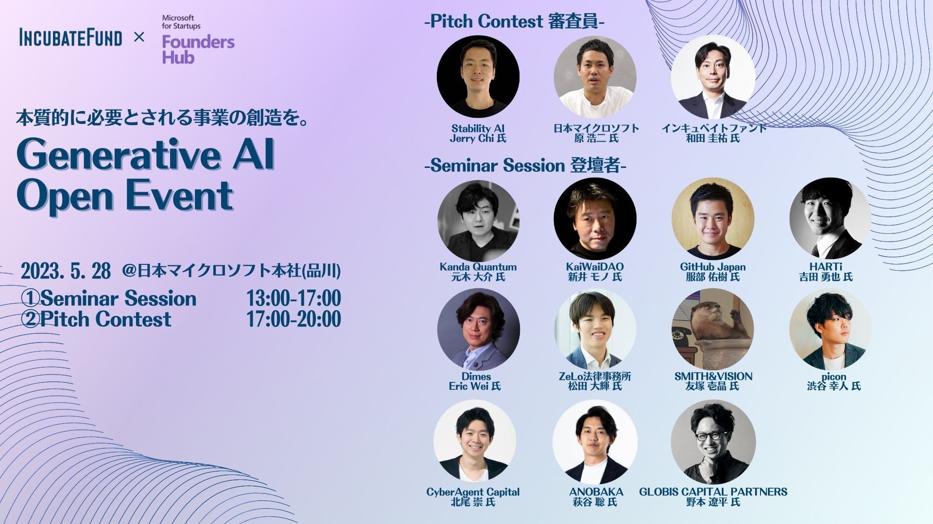 ピッチイベントでは、プログラム採択者による「AI音声変換/合成、ワークフロー自動化、ESG情報の可視化、脚本の自動生成」など、多岐に渡るテーマで事業アイデアをプレゼンさせていただきます。Generative AI領域に興味のある方や起業家、VC、メディアの皆様はぜひご応募いただけますと幸いです。
