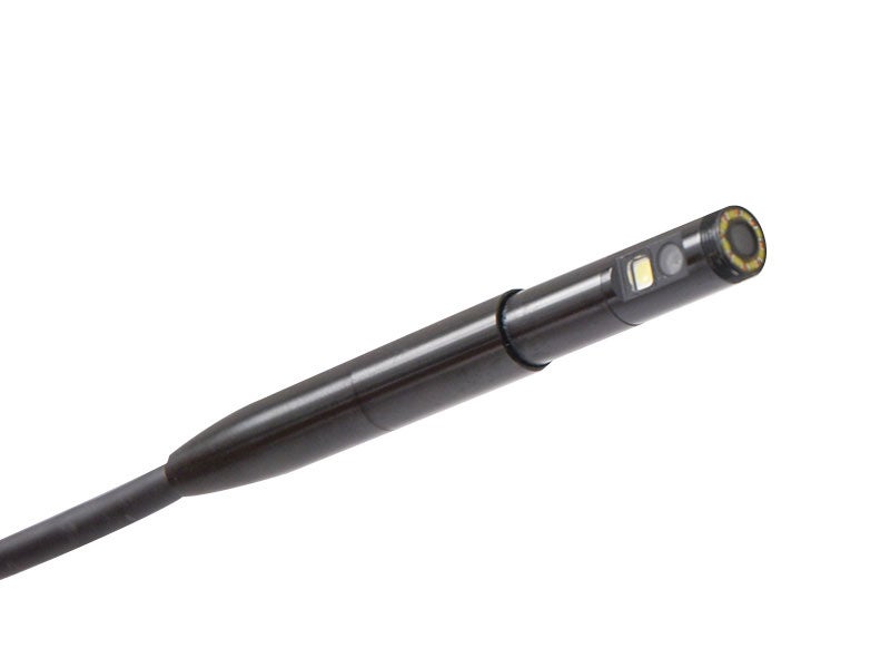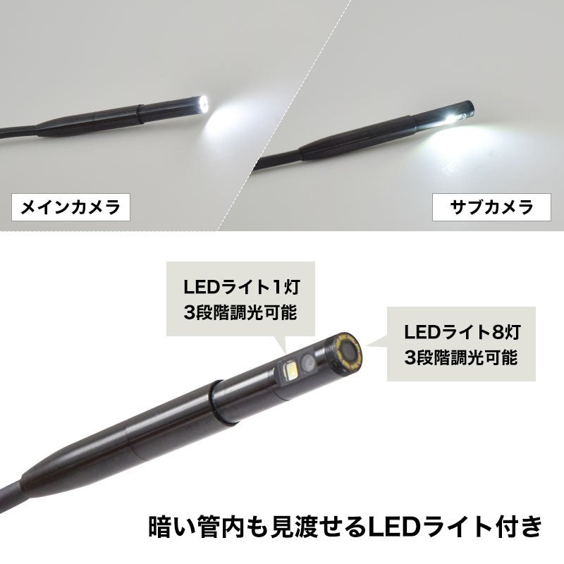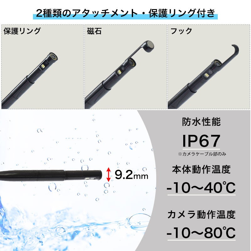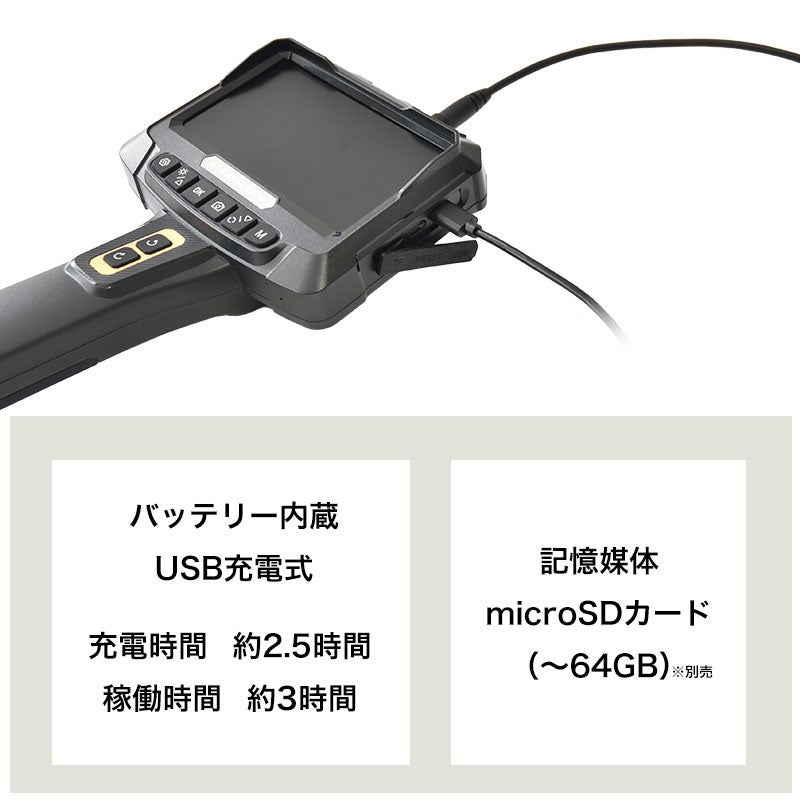 先端カメラは手元のボタン操作でスムーズに動き、確認したい場所にカメラを合わせることが可能です。自由に曲げられるフレキシブルケーブルを採用。ケーブル長1/2/3/5Mの4種類からお選びいただけます。IP67防水性能(カメラケーブル部)。先端カメラ部に取り付けて使う磁石アタッチメント、フックアタッチメントが付属。3段階の明るさ調整が可能なライトを搭載(正面8灯、側面1灯)。USB充電式。静止画、動画の記録が可能。5インチディスプレイを採用。