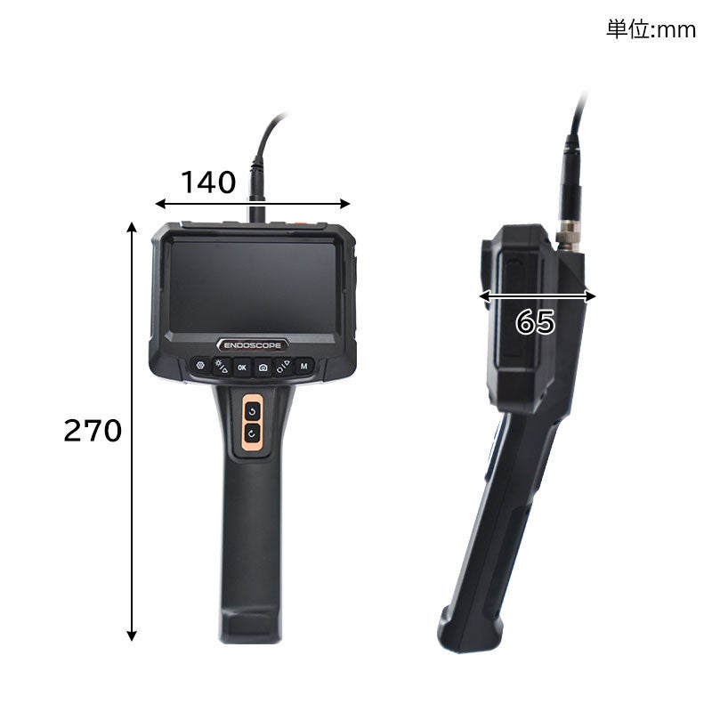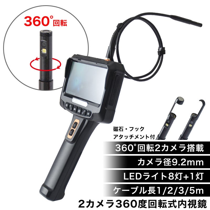 本製品は先端カメラ径9.2mm、正面と側面にカメラを搭載し手元操作で360度カメラが回転する工業内視鏡です。
