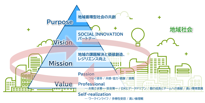 こうした取り組みを更に加速し、NTT東日本グループすべてのステークホルダーの方々の共感を得ながら、地域のみなさまとともに持続可能な循環型の地域社会を実現していきたいという想いから、新たに「パーパス(存在意義)」を定義し、それに向けた「ビジョン(なりたい姿)」、「ミッション(使命)」、「バリュー(価値観と行動基準)」を制定しました。