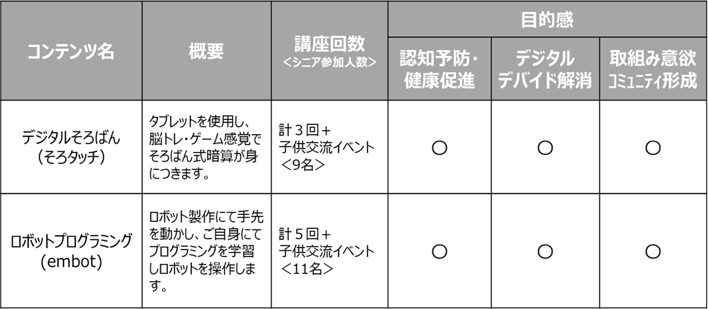 今回のテストマーケティングを通じて得られた結果から、「シニア層に対するICT教材・ツール活用」「子どもに教えることを目標設定したカリキュラム設計」「カリキュラムを通じたコミュニティ形成・交流促進」等の観点から、シニア層に対する当該コンテンツ活用が有効と考え、共通的な地域課題である「高齢化」「デジタルデバイド」等の解決に貢献できるよう、各自治体における地域に根ざしたサスティナブルな取り組みへの展開をめざします。