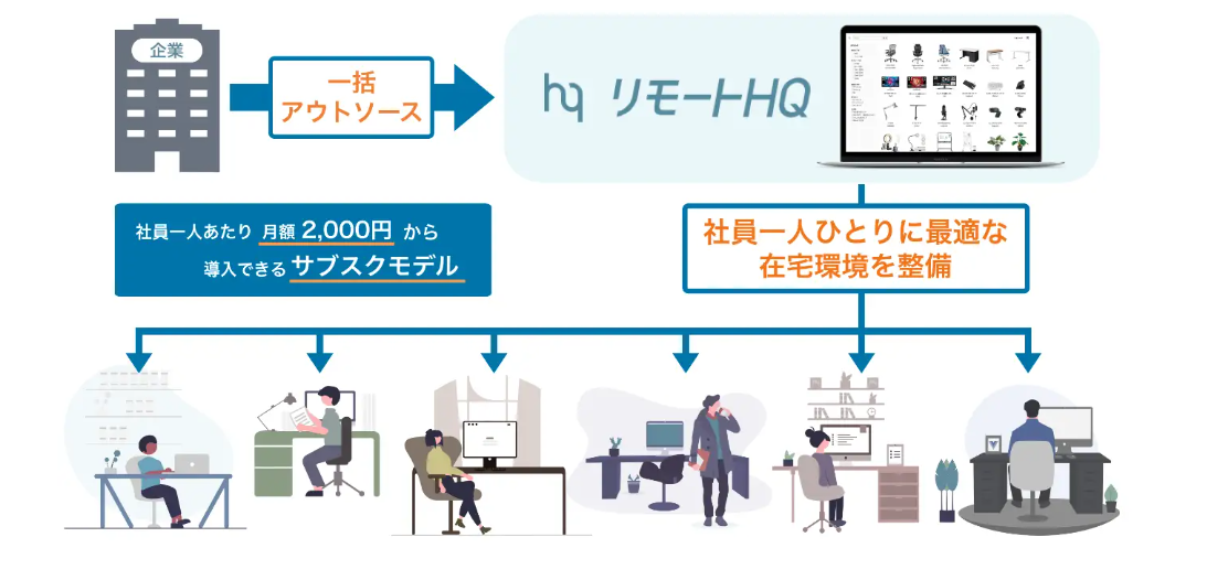 「リモートHQ」は、リモートワークを導入する企業が、社員一人ひとりにとって最適なリモートワーク環境を整備できる、これまでにないサービスです。