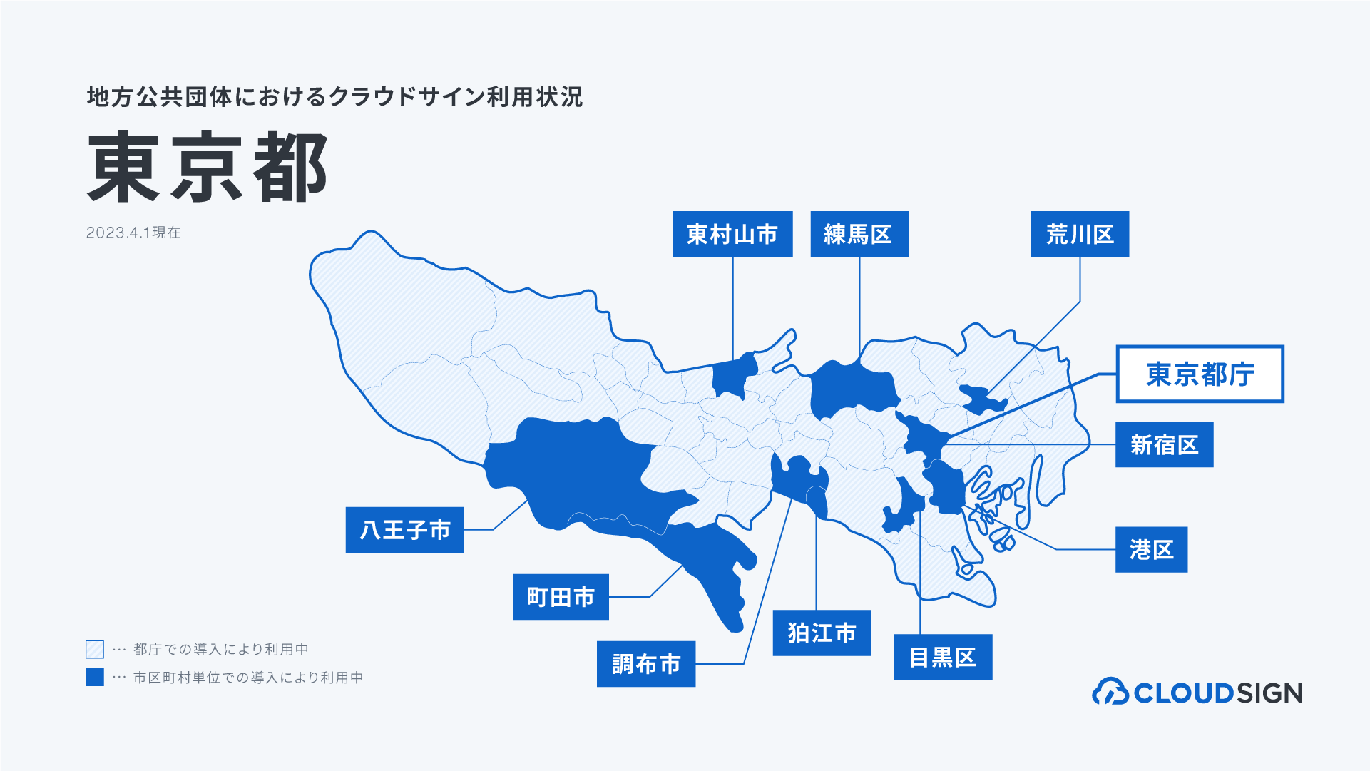 本共同調達の参加団体は、港区、新宿区、目黒区、荒川区、練馬区、八王子市、調布市、町田市、東村山市、狛江市、ほか計11団体。各団体における電子契約サービスの運用開始時期は、一部の団体を除き2023年7月頃を予定しております。