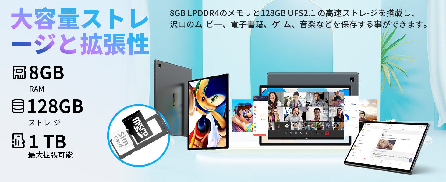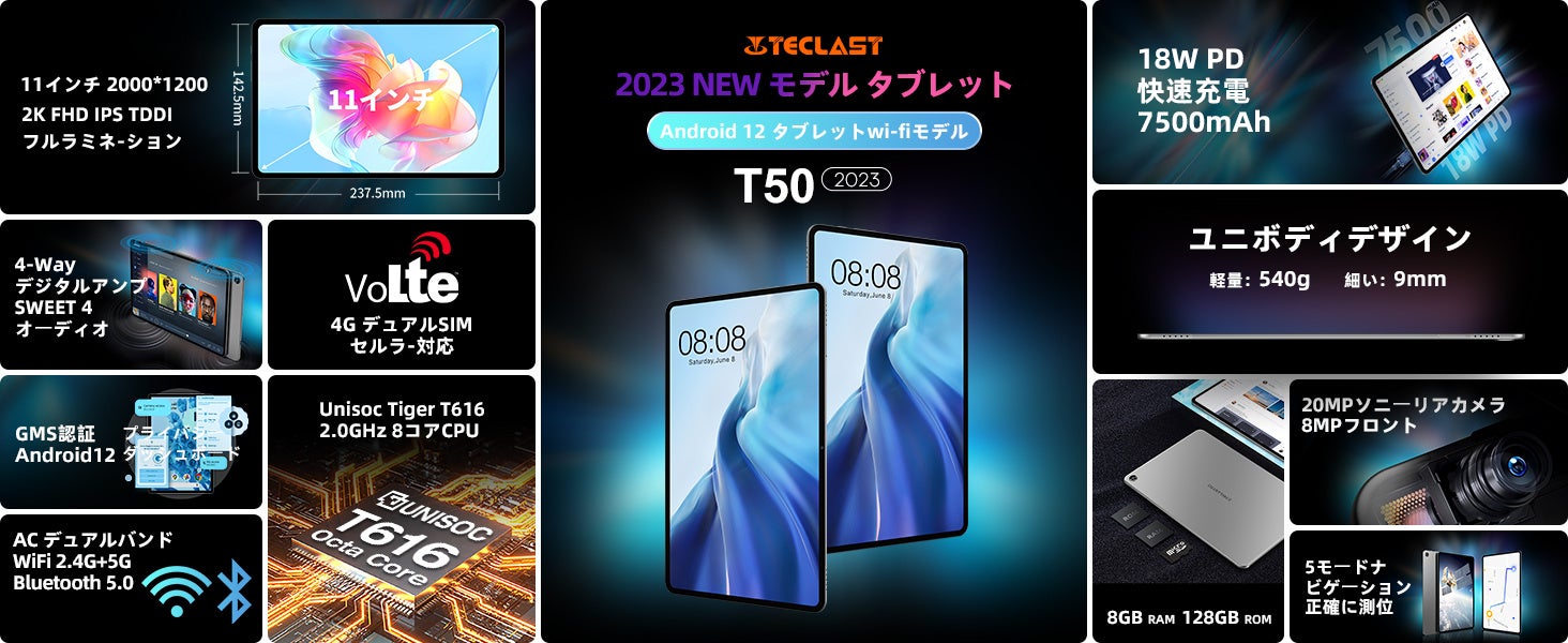Teclast「T50」は、UNISOC Tiger T616は12nmプロセスを使用し、2つのArm Cortex-A75ハイパワーコアと6つのCortex-A55インテリジェントAIコアを搭載しています。発熱を抑えながら優れた性能を維持します。RAMは8GBで、スムーズな体験を提供できます。ストレージは128GBで、マルチタスクとファイルの保存を心配することなく楽しめます。更に多くのストレージを実現するMicro SDカードの拡張もサポートしています。