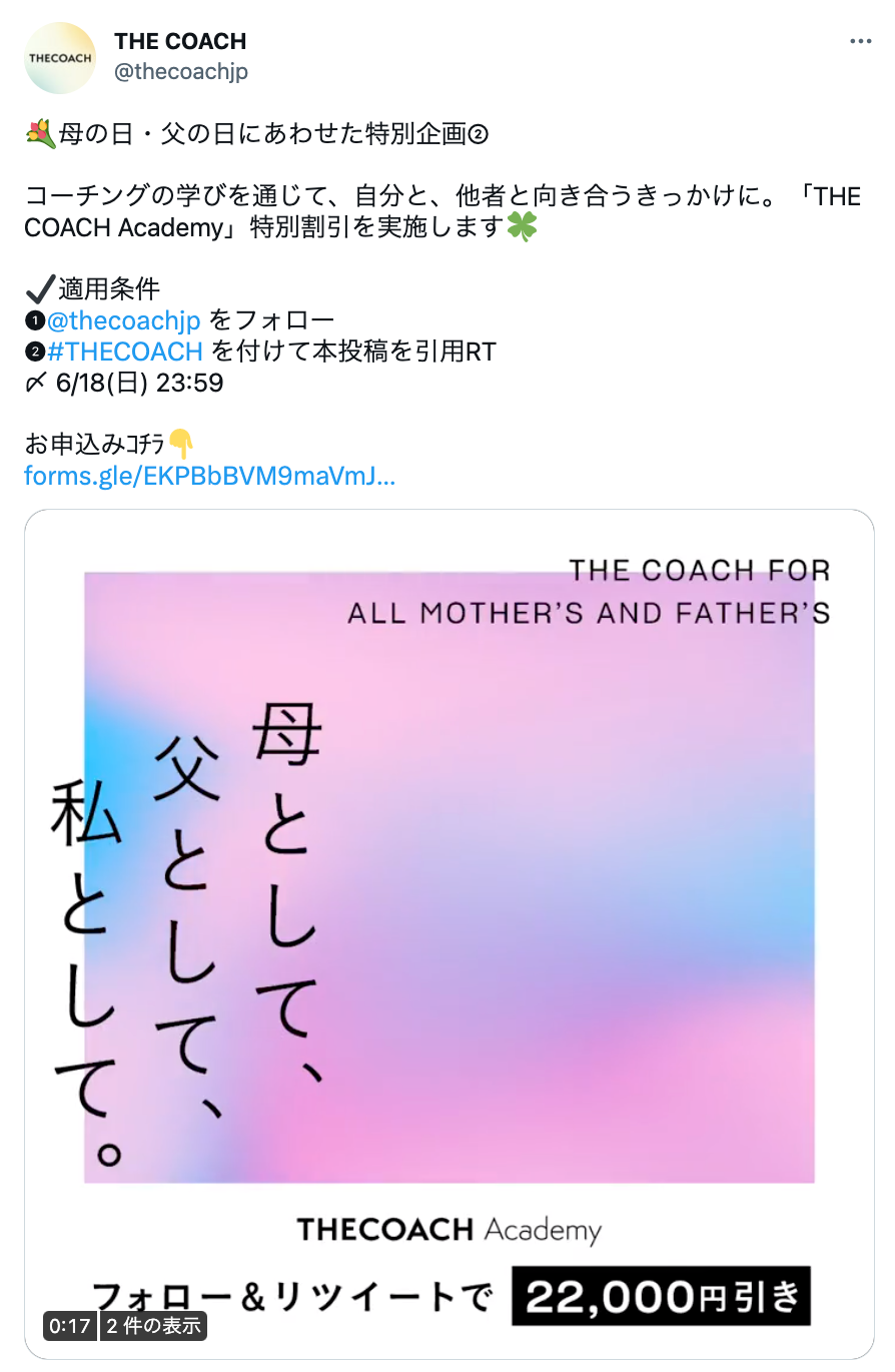 期間内に、THE COACH Twitterアカウント(https://twitter.com/thecoachjp)をフォローし、指定の投稿をリツイートいただくと、THE COACH Academy受講料22,000円(税別)がお得になります。