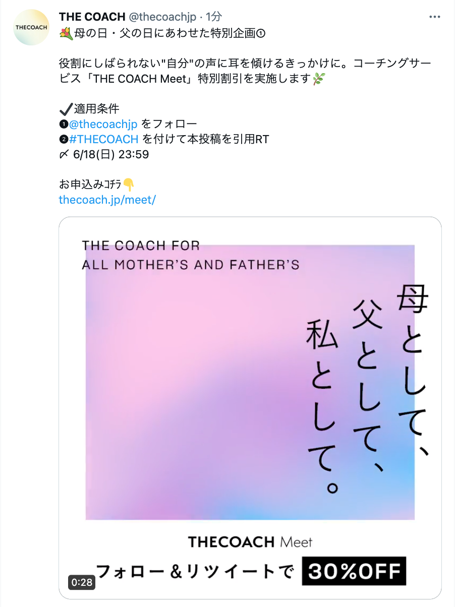 期間内に、THE COACH Twitterアカウント(https://twitter.com/thecoachjp)をフォローし、「#THECOACH」をつけて指定の投稿を引用リツイートいただくと、「THE COACH Meet」でのセッションを30%OFFで受けることができます。