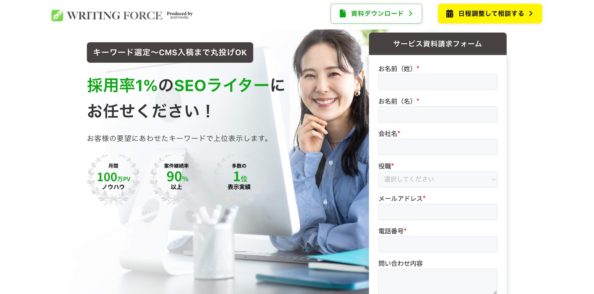 ライティングフォースは、採用率1%のライターがお客様の要望に合わせたキーワードで上位表示獲得を目的として、記事作成を代行するサービスです。