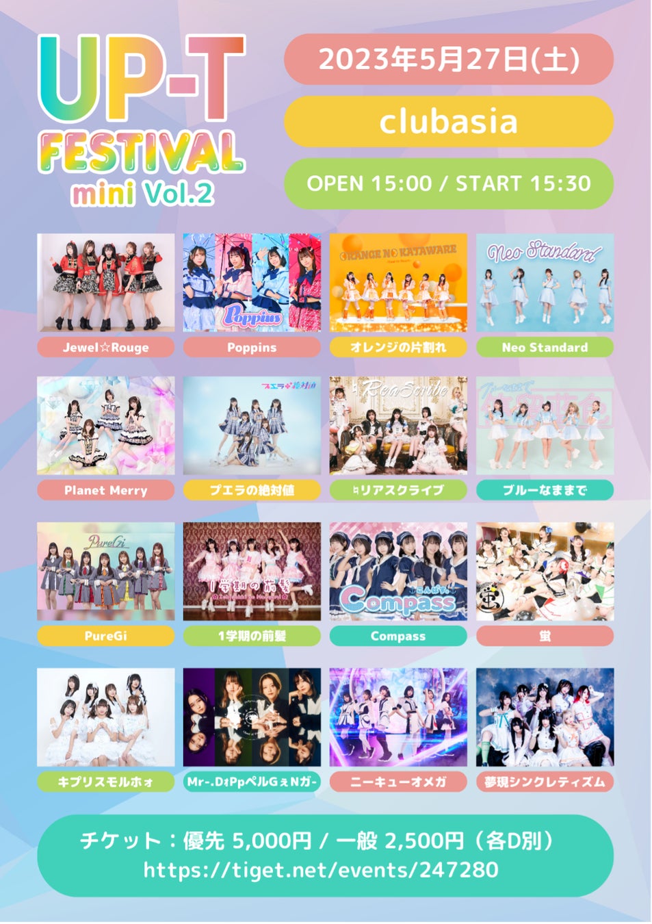 アイドルファン必見!2023年5月27日(土)にclubasia(渋谷)で【 UP-T FESTIVAL mini vol.2 】が開催されます!このイベントは、UP-T FESTIVALの姉妹イベントで、多くのファンの方を動員したアイドルグループがUP-T FESTIVALに出演する権利を得ることができます。さらに、テーマが「下剋上」となっており、アイドル界で新たな飛躍を目指すアイドルグループが熱いステージを繰り広げられます!推しの躍動する姿を目に焼き付けよう!
