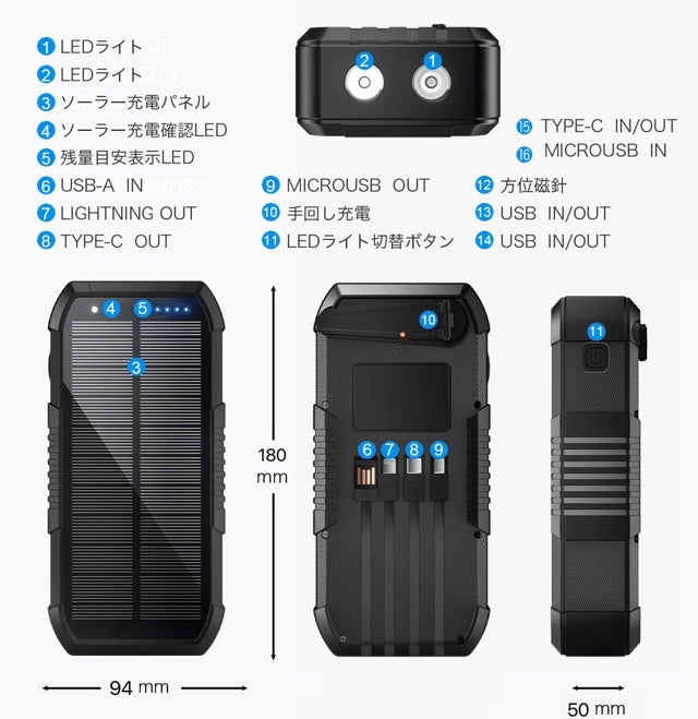 また、V18超大容量バッテリーはソーラー充電ができます。アウトドアや災害の時に電源がない場所でも太陽の光さえあれば充電できます。キャップ/野外BBQ/自転車乗り/停電など様々なシーンで活躍できます。