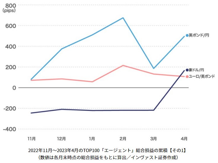 2022年11月~2023年4月のTOP100「エージェント」総合損益では、英ポンド/円がトップでした。3月のマイナス分を取り戻せたわけではありませんが、4月は大きなプラスでした。