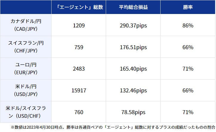 通貨ペアごとの「エージェント」全体の平均総合損益を比較すると、4月のTOPはカナダドル/円でした。平均総合損益が約290pipsで、勝率は86%と良い成績を残せました。