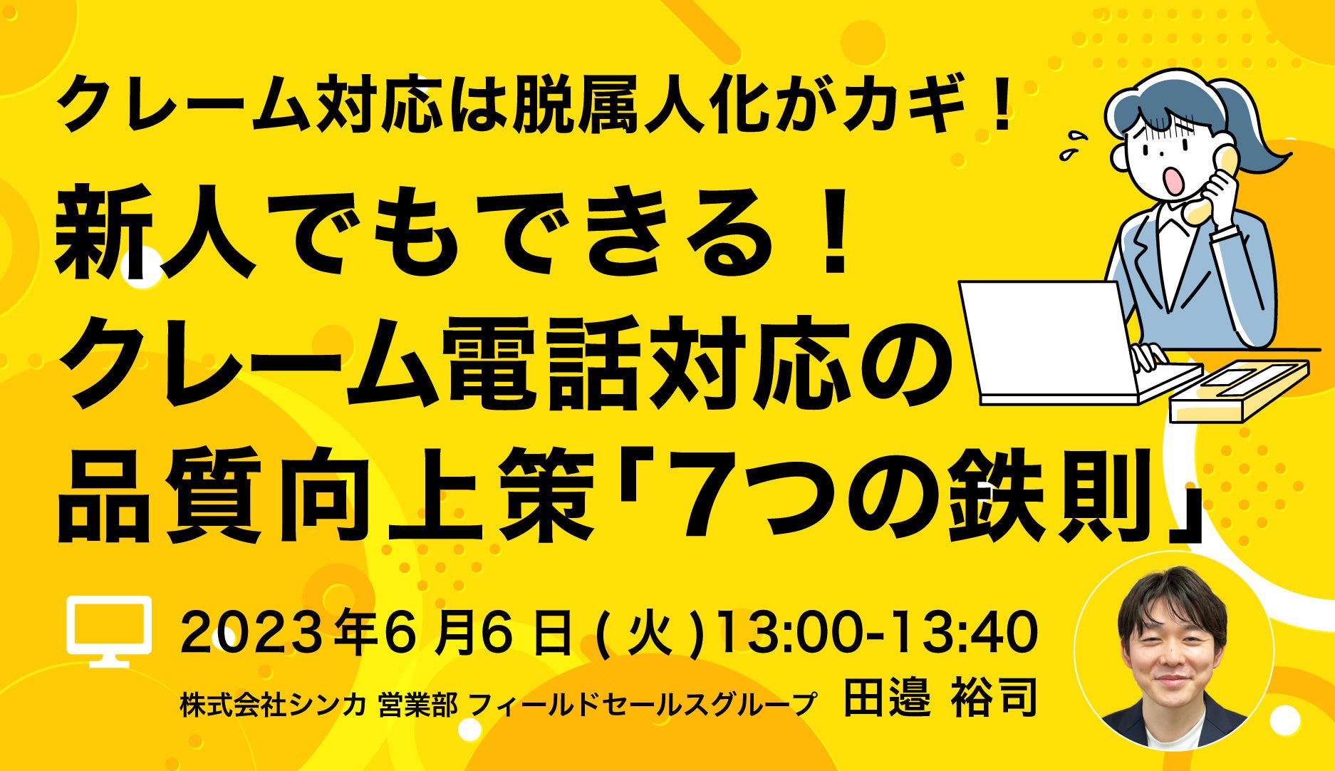 今回は「クレーム対応の脱属人化」と「クレーム電話対応の品質向上」にフォーカスして、社内の体制構築、新人でもできる電話対応の方法をお話いたします。
