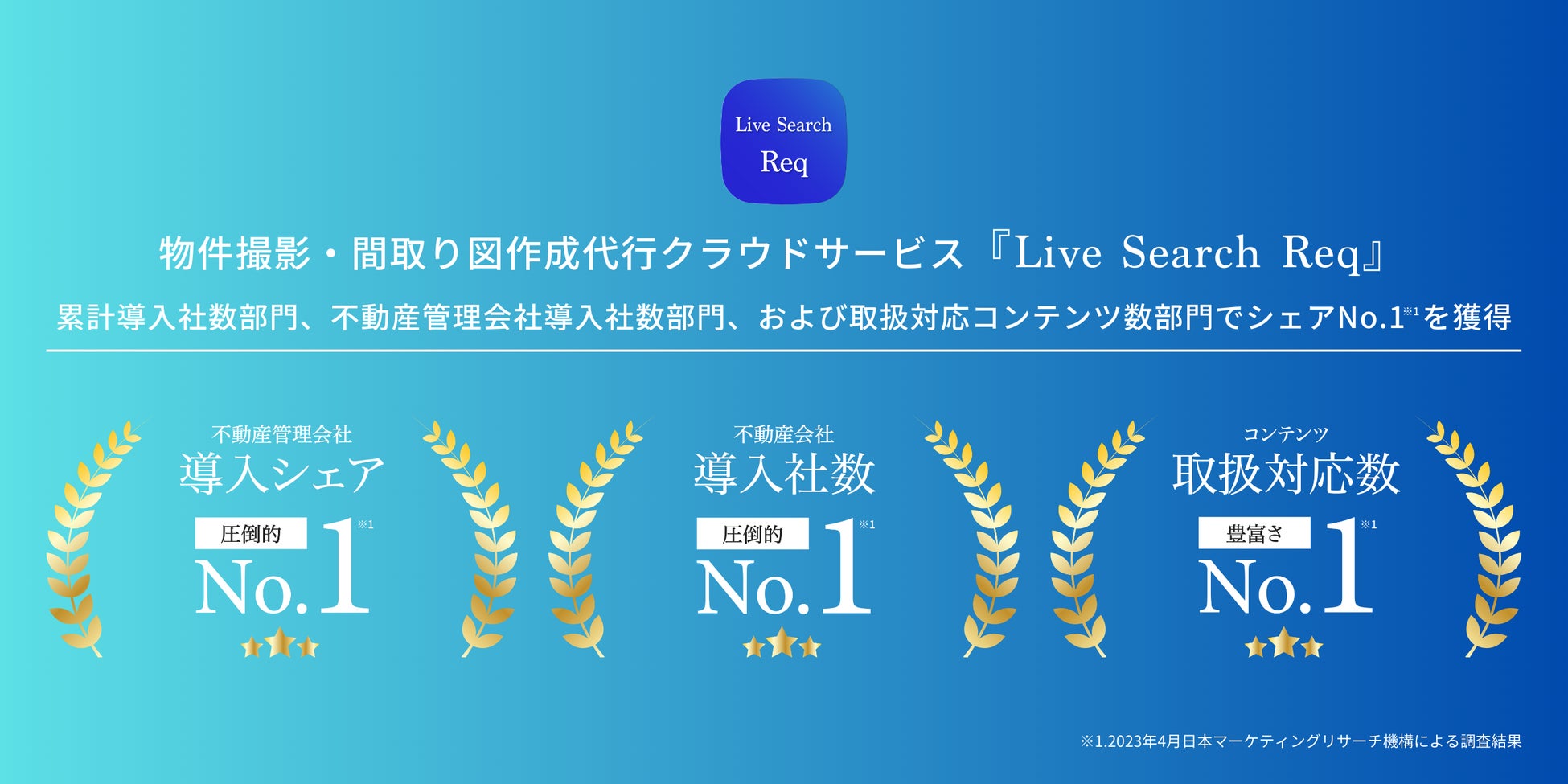 日本マーケティングリサーチ機構の調査により、物件撮影・間取り図作成代行クラウドサービス「Req」は、以下の3部門においてNo.1を獲得いたしました。物件写真・間取り図・360°パノラマVR・動画・3DCGバーチャルホームステージングのコンテンツに対応しており不動産物件コンテンツを全て網羅しているのはLive Searchのみとなります。