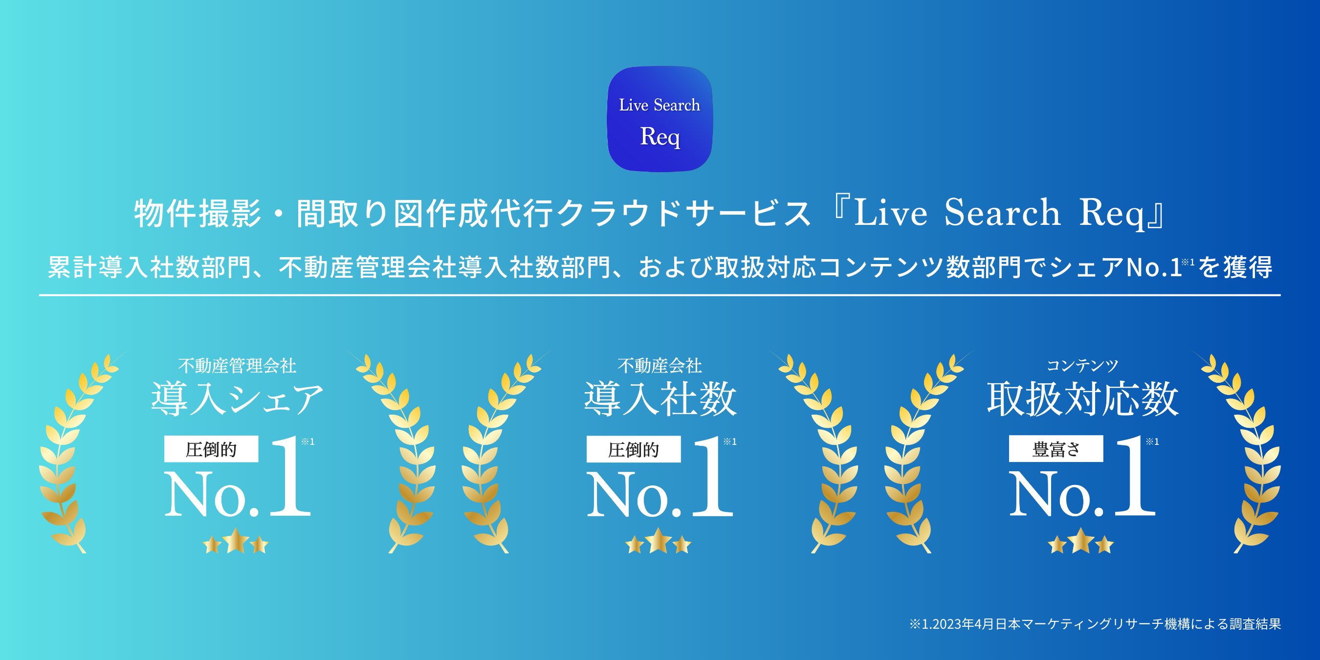 日本マーケティングリサーチ機構の調査により、物件撮影・間取り図作成代行クラウドサービス「Req」は、以下の3部門においてNo.1を獲得いたしました。物件写真・間取り図・360°パノラマVR・動画・3DCGバーチャルホームステージングのコンテンツに対応しており不動産物件コンテンツを全て網羅しているのはLive Searchのみとなります。