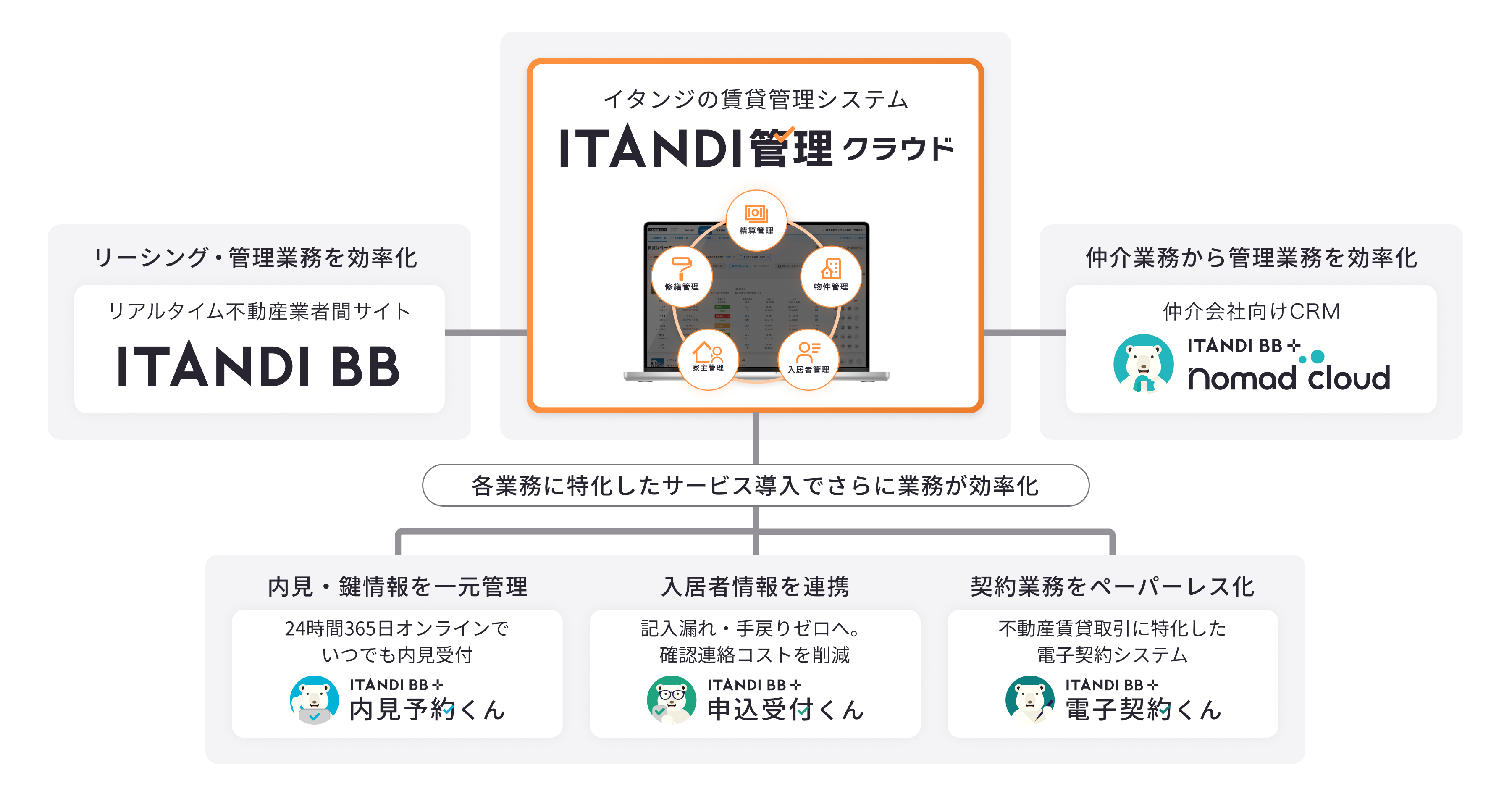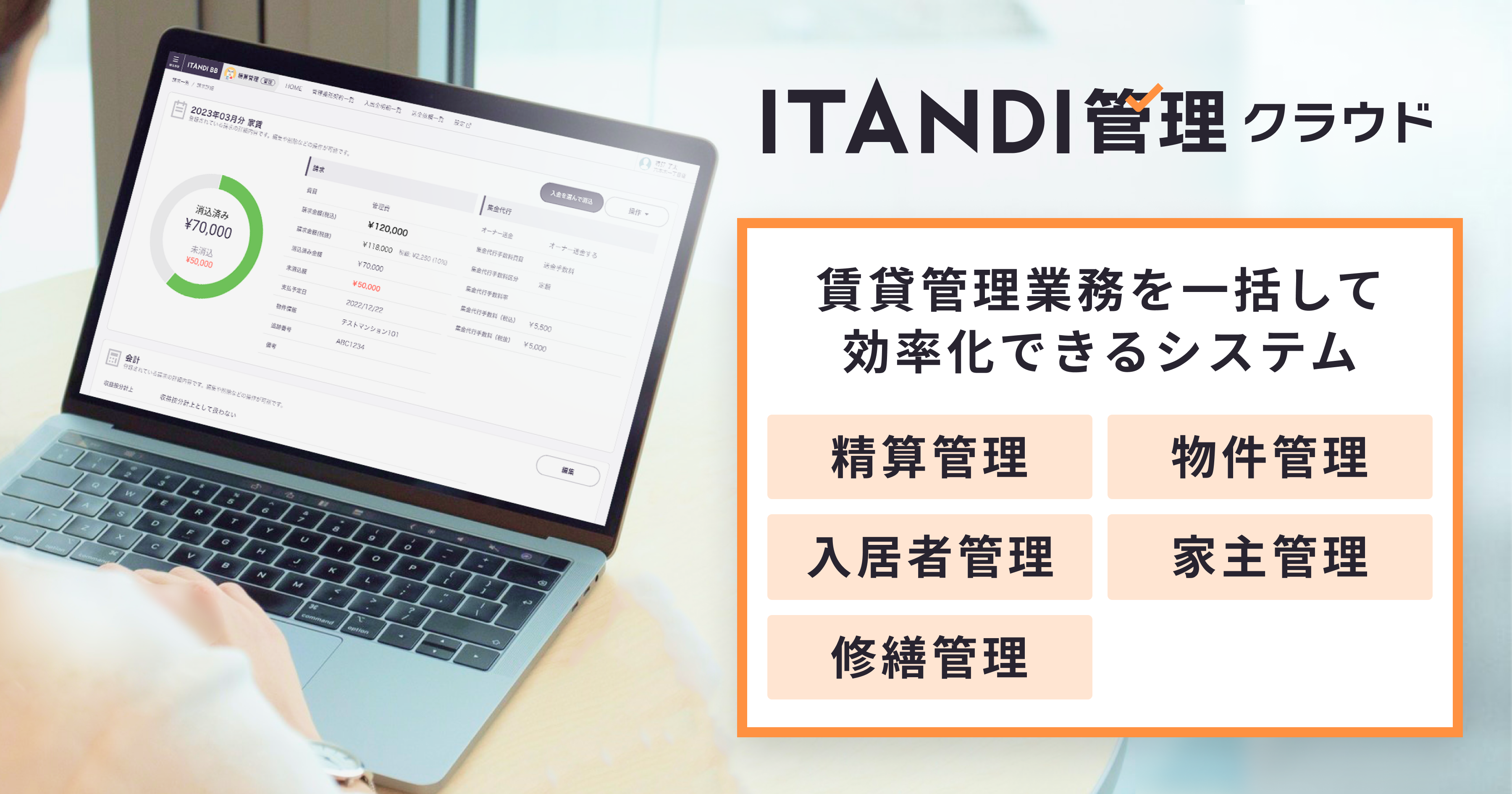 「イタンジ管理クラウド」は、データ分析に基づく収益性と物件オーナーなどの顧客満足度の向上をコンセプトとし、賃貸管理業務における精算管理・物件管理・入居者管理・家主管理・修繕管理を一括して効率化する新しい賃貸管理システムです。