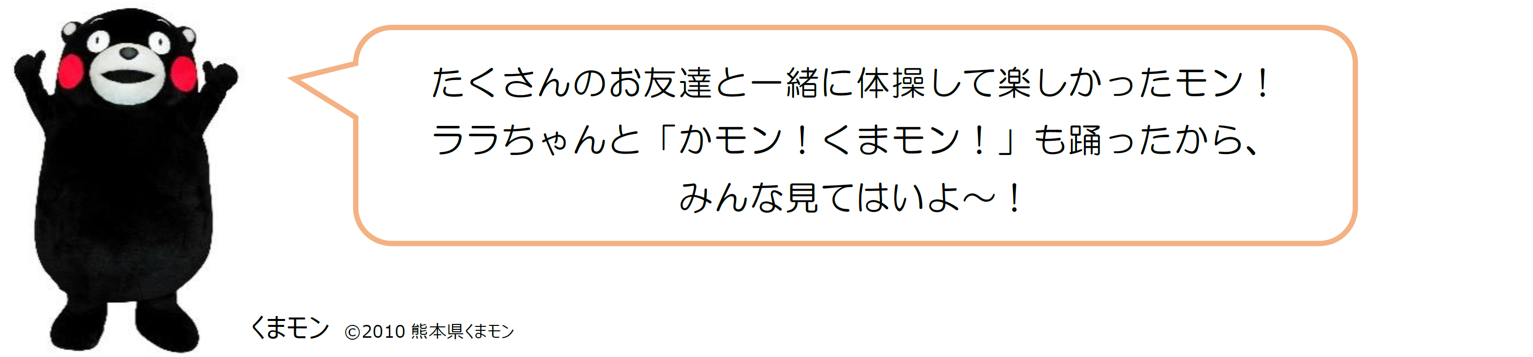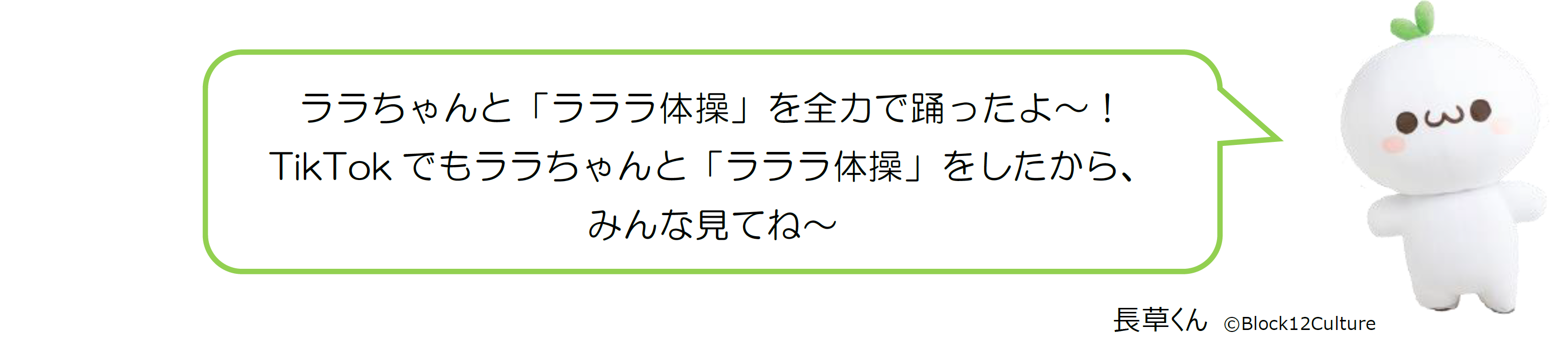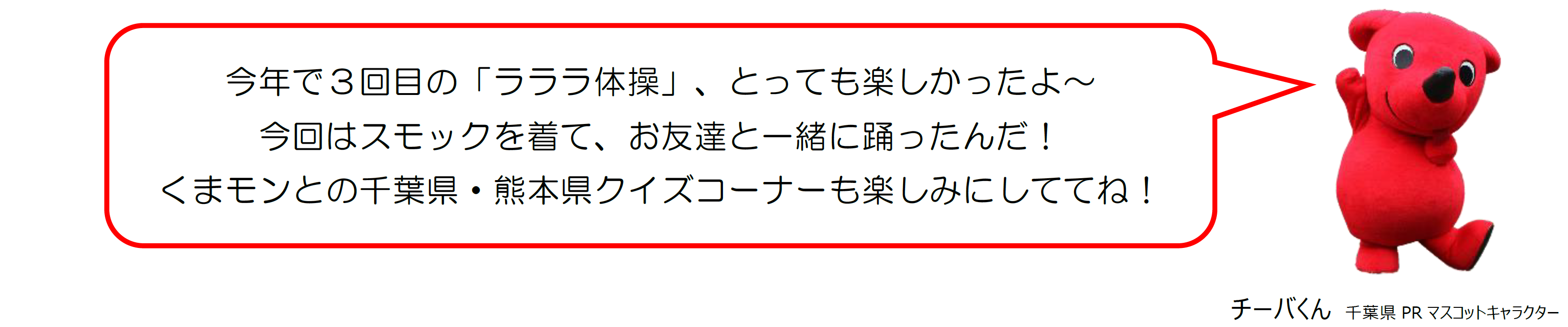 この度、「ラララ体操」に遊びに来てくれるゲストキャラクターが決定しました。期間中にポンちゃん、長草くん、くまモン、チーバくんが登場しララちゃんと一緒に「ラララ体操」を行います。
