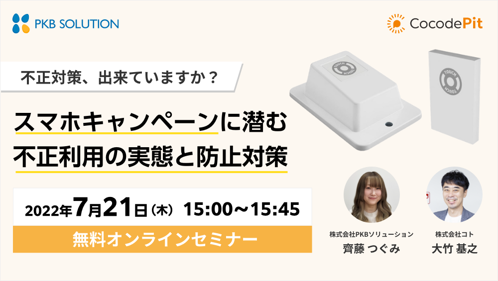 今回のウェビナーでは、「CocodePit」の紹介のほか、実は身近で発生している可能性のあるスマホキャンペーンでの不正実態やその対策方法をご案内します。