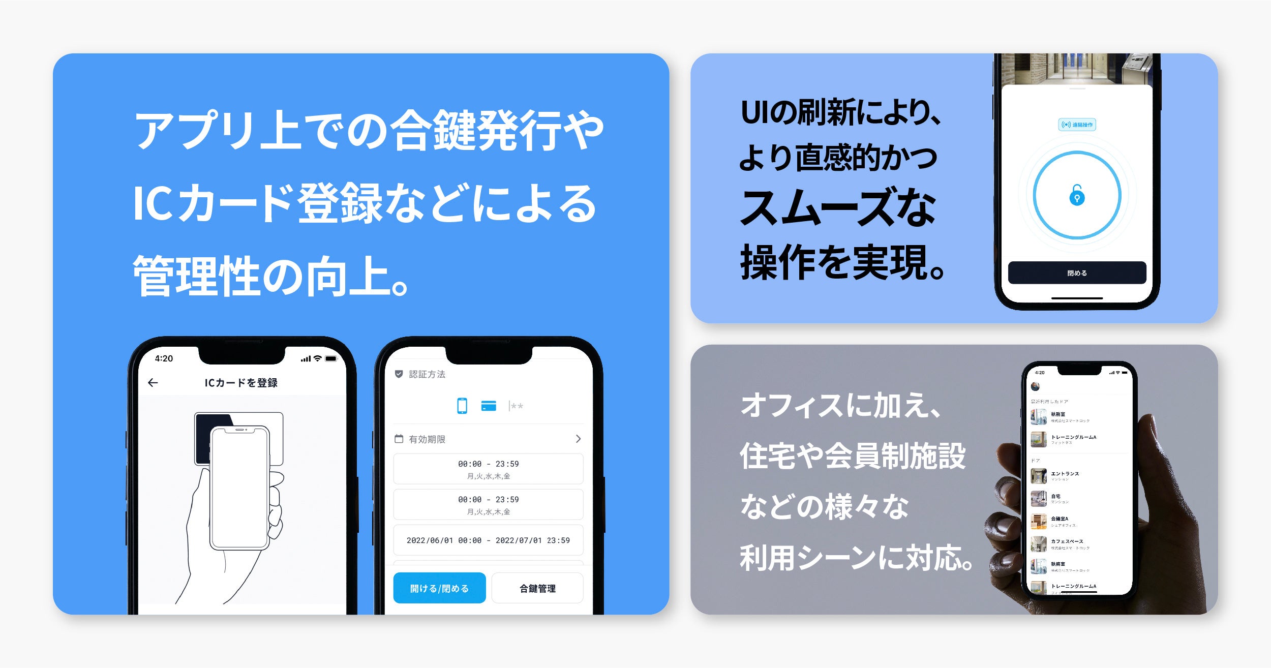 Akerunアプリ全体のUIを刷新し、Akerunが設置されたドア一覧画面へのスムーズなアクセスや、ドアごとの利用可能な日時などの詳細表示など、管理者/利用者がより直感的かつスムーズに必要な情報や操作画面にアクセスできるようになりました。