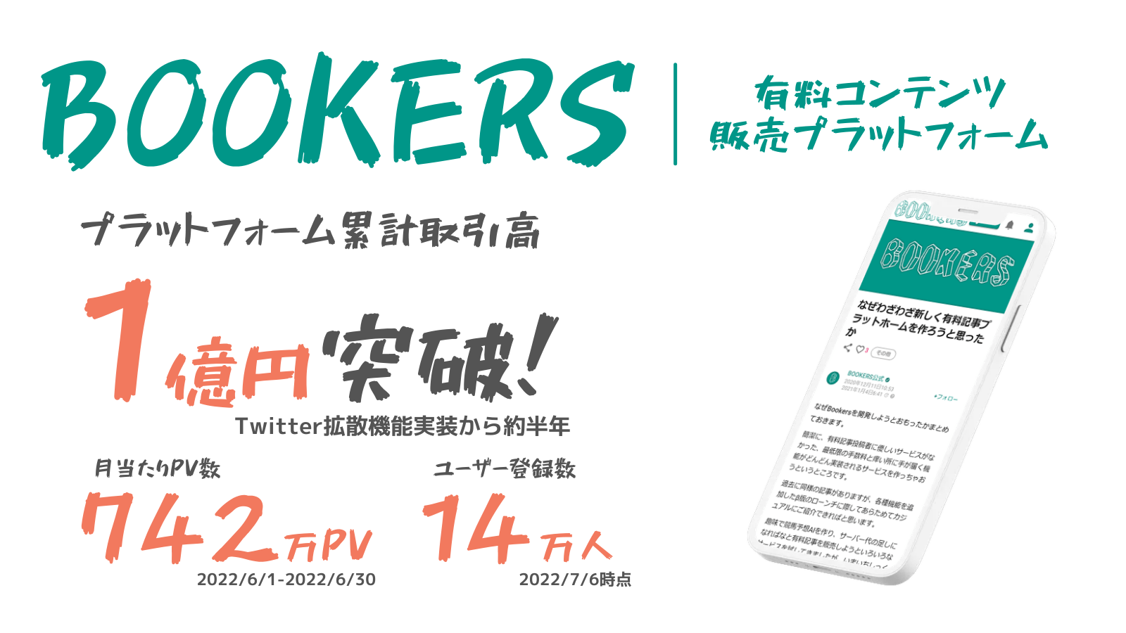 RHT合同会社(本社:東京都墨田区、代表:渡辺剛志)は、有料記事販売プラットフォーム「BOOKERS」(ブッカーズ)にて、好評のTwitter拡散機能実装から約半年の2022年7月に累計取引高が1億円・ユーザー数が14万人を突破したことを発表いたします。
