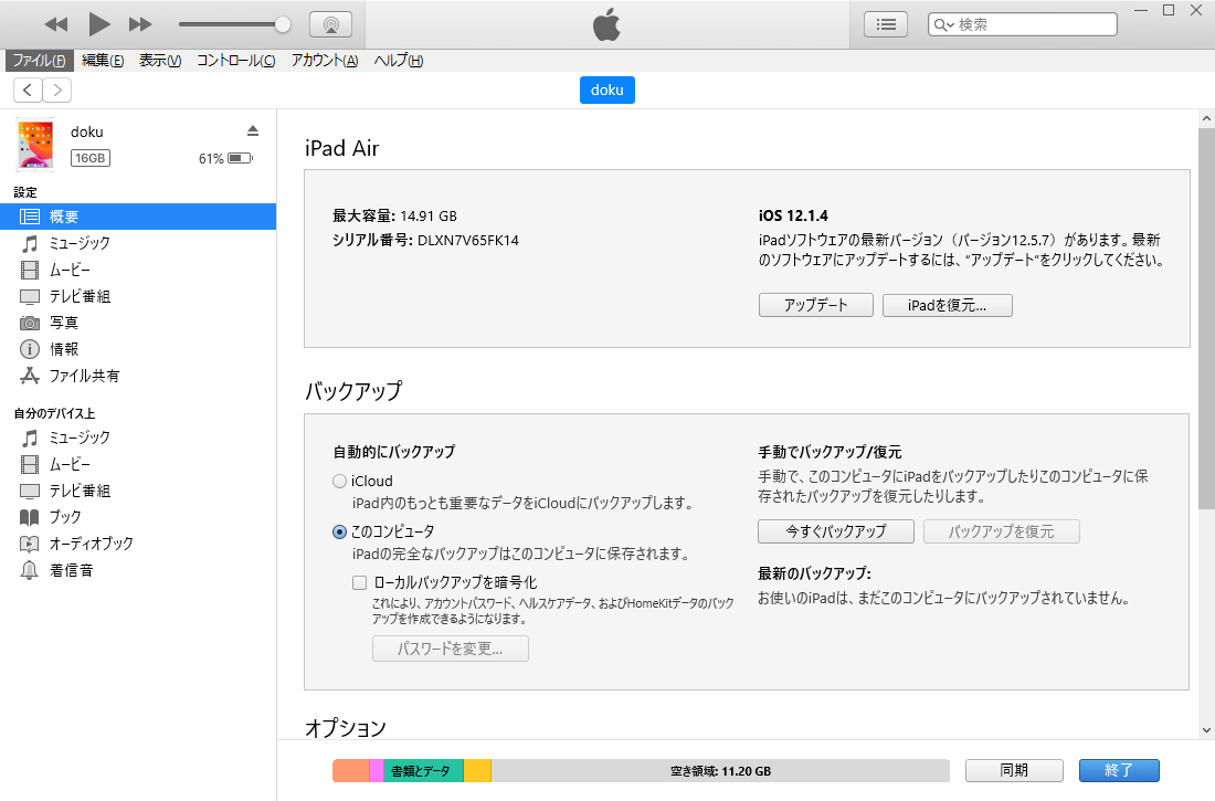 3.「概要」から「このカンピューター」をチェックして、「今すぐバックアップ」をクリックします。すると、iPadのデータをパソコンに保存します。