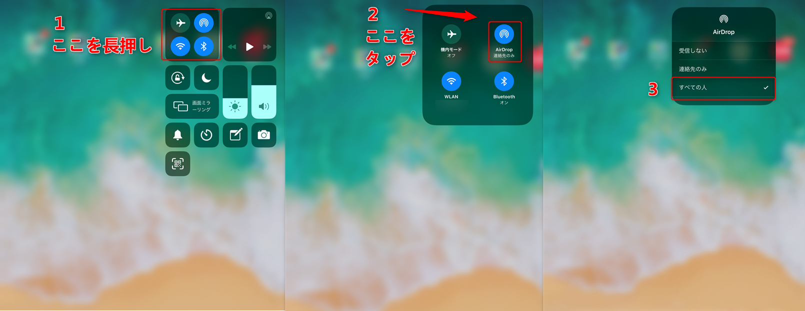1. iPadとパソコンの両方でWi-FiとBluetoothをオンにします。受信対象は「すべての人」を選択します。