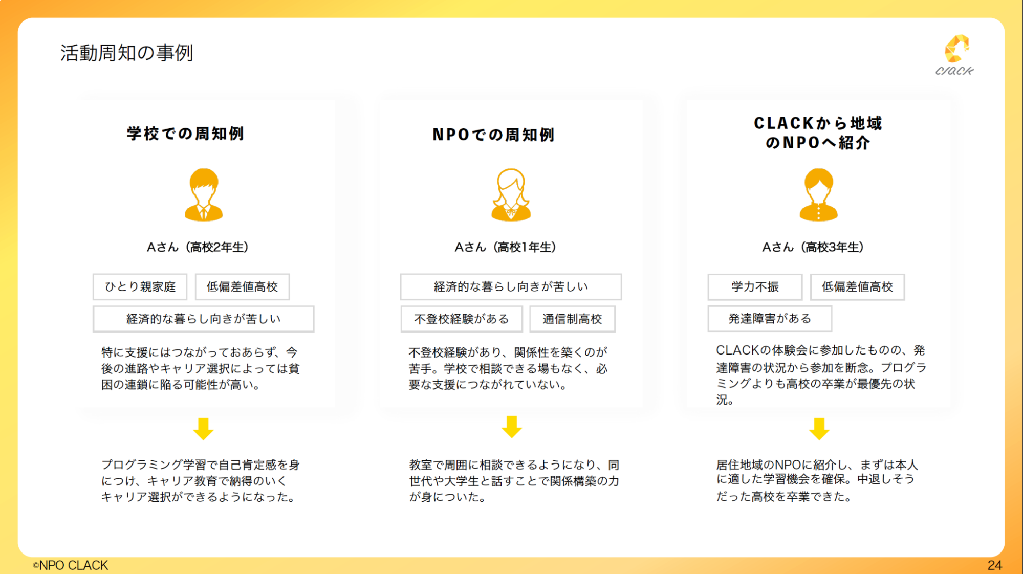 これからの子どもたちにとって、ITスキルは欠かせませんが、デジタルデバイドはますます拡大しているように感じます。関西で活躍するNPO法人CLACK様が東京でも活動を始められ、高校生への支援を拡充されることを大変嬉しく思っています。これからのご活躍を大いに期待しております。